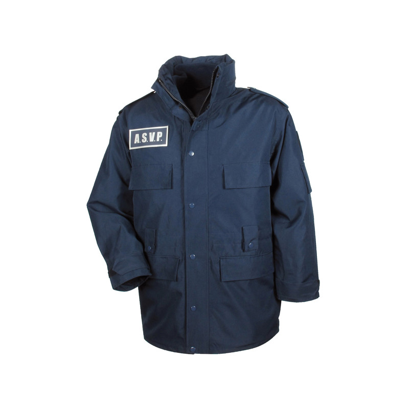85% polyester 15% PU - 250 g Bleu marine - Microporeux - 2 couches imper-respirant Doublure et col polaire amovible Flaps amovibles " ASVP" coeur et dos