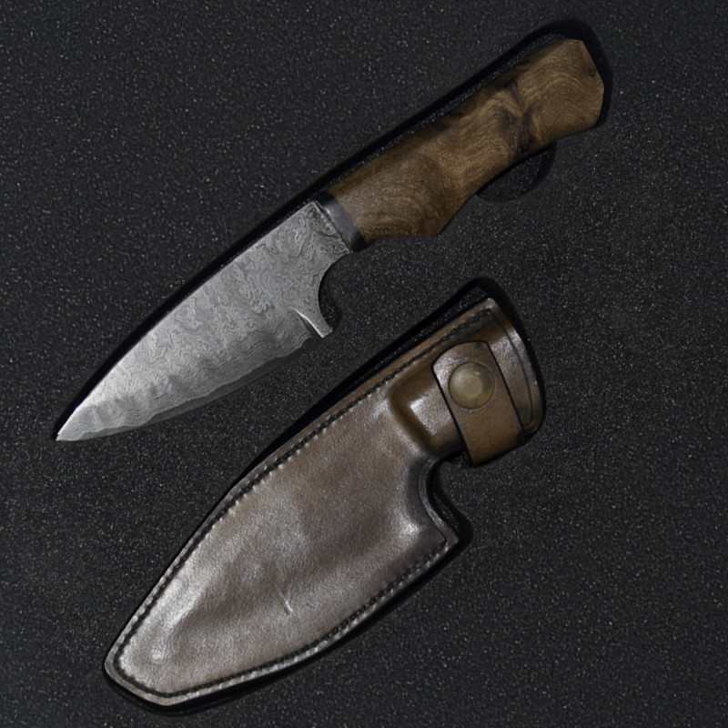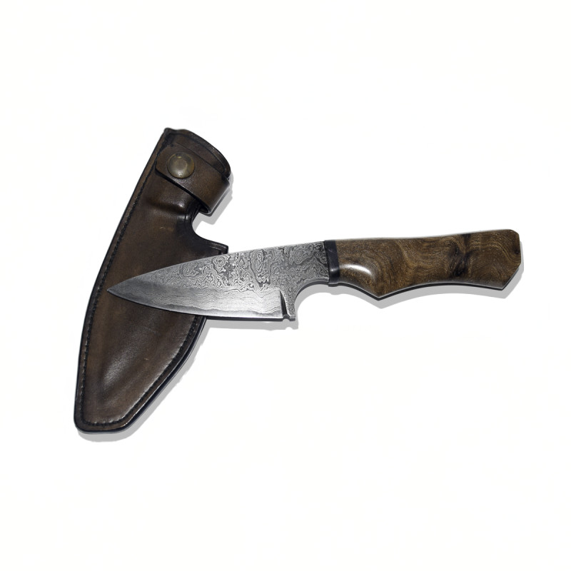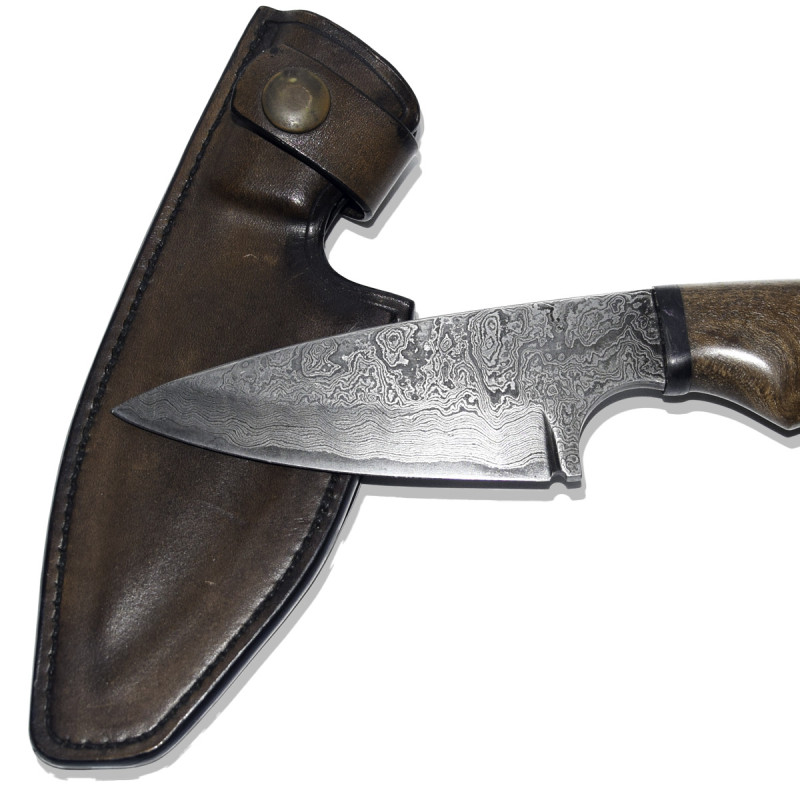 Sa lame en acier Damas, issue d’un assemblage minutieux de couches d’acier soudées et repliées, offre un tranchant remarquable. Le manche en bois d’orme, monté sur soie, apporte une prise en main ergonomique. Le couteau est accompagné d’une housse sur mesure en cuir, réalisée artisanalement pour assurer la protection et le transport du couteau damas.