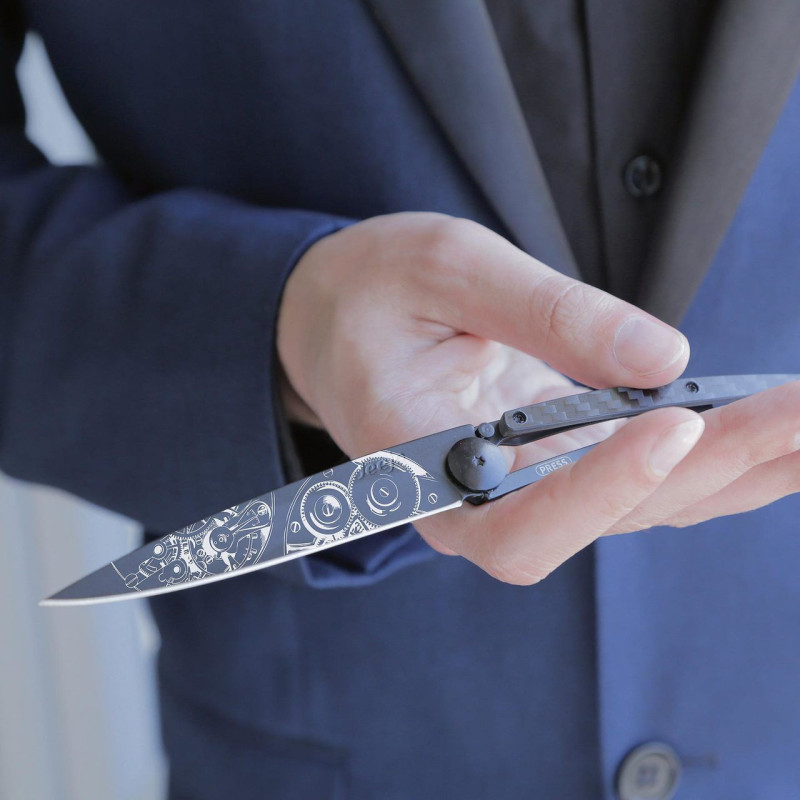 lame acier X50CrMoV15 à cran intérieur, manche 11 cm habillage bois de kotibé, avec clip ceinture/porte-billets. Gravure « maison à colombage » sur l'axe du couteau.