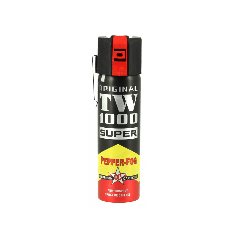 Bombe lacrymogène TW 1000 Pepper-Jet avec une projection de jet liquide au poivre.